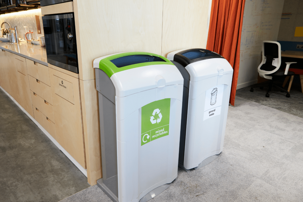 Las empresas generan tantos residuos o más que en un hogar, por tanto, es imprescindible que encuentres contenedores de reciclaje cerca de tu local y que incentives la correcta clasificación de residuos entre tus empleados. Mediante cartelería o identificación de cubos es posible sensibilizar a los trabajadores a que aporten su grano de arena de forma correcta.